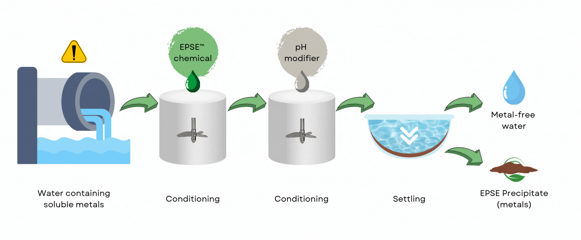 Процесс очистки воды методом EPSE ™ основан на дозировании химического вещества EPSE ™ и регулировке уровня pH. В результате процесса образуется перелив, не содержащий металлов, и нерастворимый осадок, который можно классифицировать как инертные отходы, не требующие специального хранения или специальных разрешений, как это делают опасные отходы. Эксплуатационные расходы метода и его внедрение, как правило, не требуют больших инвестиций. Поскольку метод EPSE ™ не зависит от температуры, энергия значительно экономится.